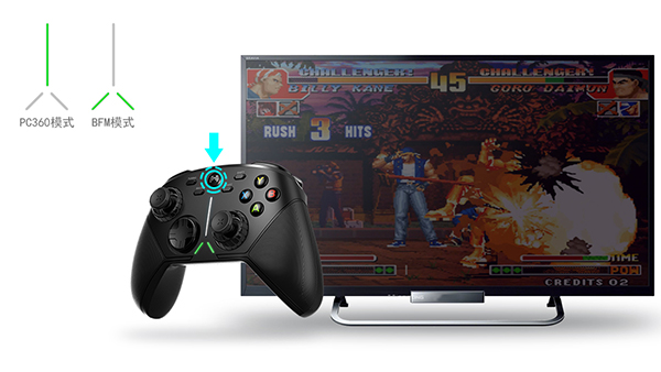 长按【北通L0GO键】3秒,切换手柄模式到BFM模式,即下灯条绿色亮起3秒,即可畅玩游戏。