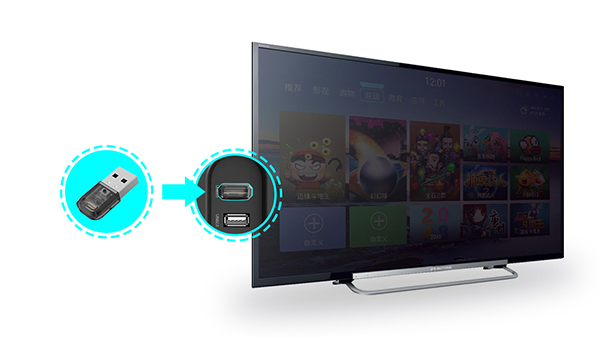 将无线接收器插入安卓电视USB接囗。