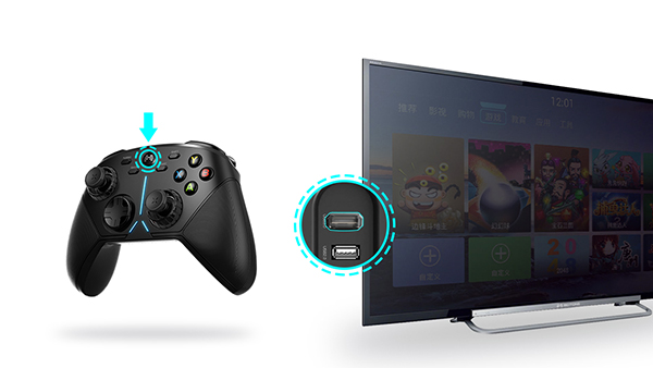 将无线接收器插入电视USB接囗后,轻按一下手柄的【北通LoGO键】开机,稍等片刻,即可自动配对连接。