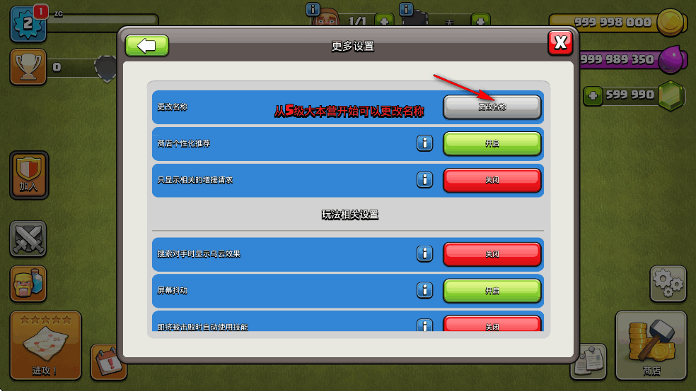 点击【更改名称】去改名(注意需要至少到5级大本营才能更改)