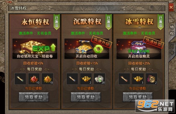 交易行淘金捡漏只能使用非绑定元宝,使用打金卡后打怪掉落的元宝才是非绑元。技能书自然不用多说,多一项技能,多一种输出,有护体神盾,保命也多了一重保障。至于特权,根据自身能力,永恒特权、沉默特权建议玩家购买,有了自动使用元宝、经验、回收,挂机基本不用再担心背包不够用,可以解放双手,如果有经济能力再购买冰雪特权可以提升打怪的效率。