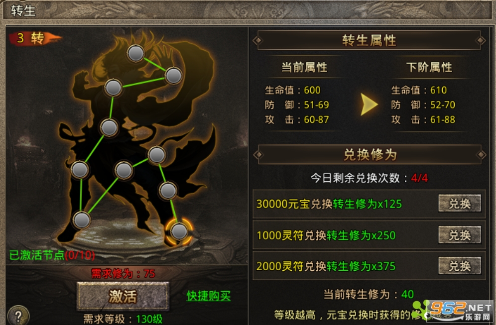 想要转生需要满足几个条件:1、等级足够;2、转生材料足够;3、修为激活10个节点。