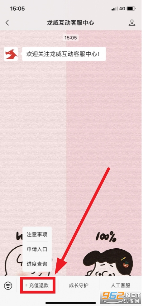 进入公众号,点击右下角充值退款。