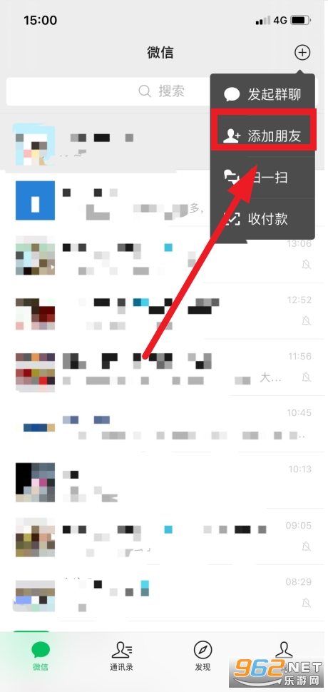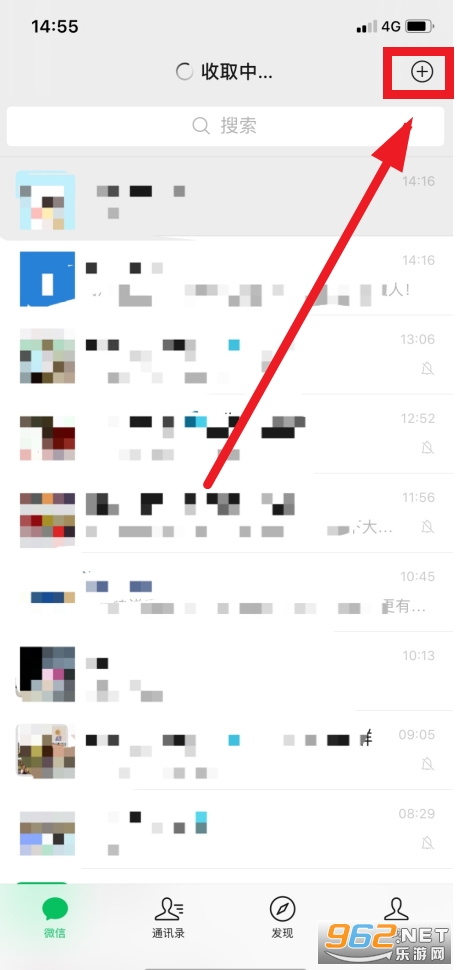 打开手机微信,点击右上角+。