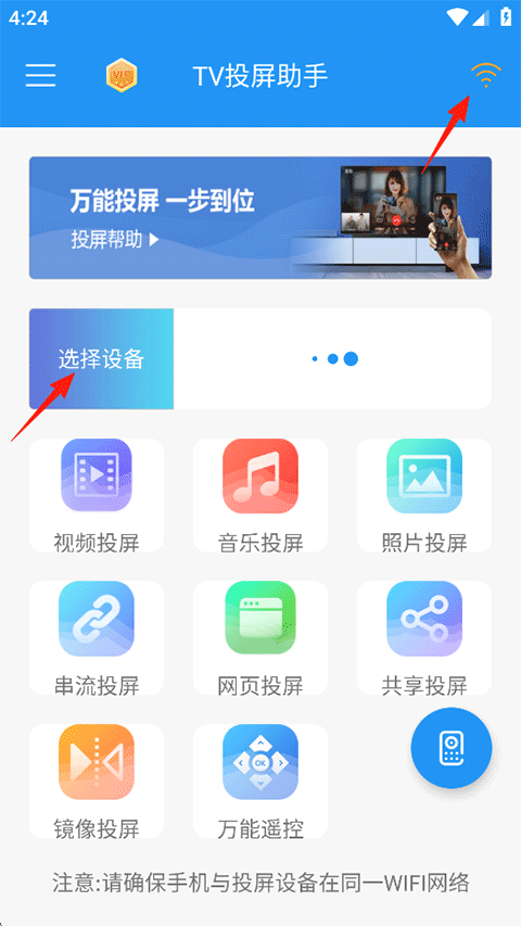 2、注意:请确保手机与投屏设备在同一WIFI网络。