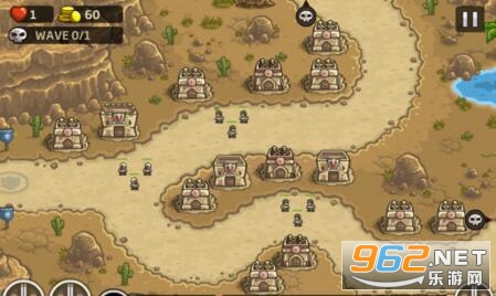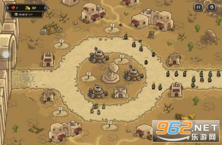 攻略:本关的重点在于死守中央路口,初始布局建议左侧弓箭塔,魔法塔;中下部弓箭塔,炸弹塔;右侧弓箭塔;中部步兵塔,弓箭塔(参考图片一)。有资金后在中部补充1座弓箭塔,1座步兵塔以稳固中央防守,增援还是冷却就用。然后升级,本关的塔可以升1级,优先升级中央的步兵塔,然后是左侧的魔法塔,再后是中央的弓箭塔和中下的炸弹塔。本关二级沙漠兵较多,在其于中央集中时用火雨。后期可酌情在后方补箭塔,总的来说本关难度不大,我通关时还有600多金。