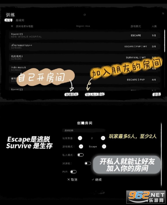 创建房间最多5人,最少2人;选择生存或者逃脱模式