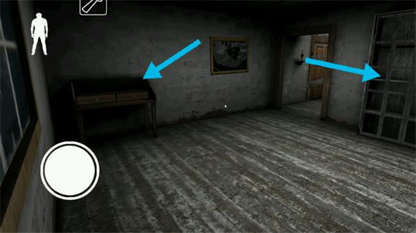下楼梯后左边的地板上有一根黑线,从上面走过铃铛会响,需要注意。楼梯旁的柜子里可以躲,柜子对面有一个门,里面可能刷东西。柜子旁边有一个门通向地下室(由于画面较暗所以不大容易发现),同时奶奶的出生地就是地下室,所以萌新不要一开始就往地下室跑哦。