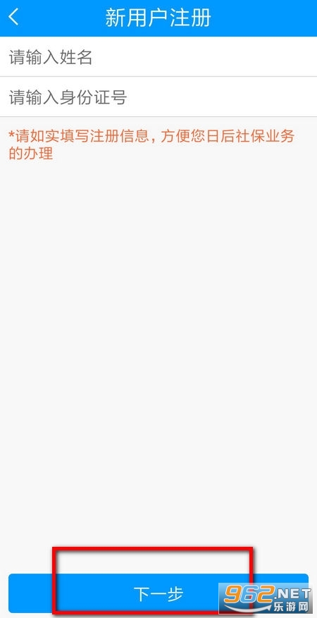 【2】输入姓名和身份证号,点击底部“下一步”;