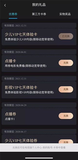 内容福利激活会员,即可领取免费体验券、点播券让你看片不受限,刷剧刷不停点击“我的会员卡”进入专属会员权益页面领取礼品