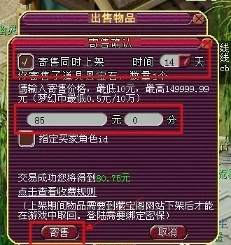 5、价格符合系统标准(标价最高为149999.99元,最低为10元。),经过玩家确认无误后,上架成功,物品可以在 [我要卖 → 已上架物品] 中查到。(交易成功后系统将对卖方收取一定的发布寄售信息的信息费,信息费从所得货款中划扣,点击这里查看详细收费标准。)