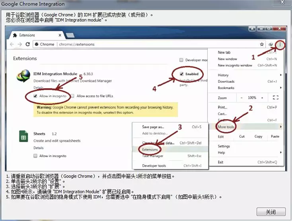 9、会看到这样一个弹窗,讲的是如何在谷歌浏览器中安装此软件的插件,只有在浏览器中安装了各自浏览器中对应的插件,在浏览器中下载东西时,才会自动跳转到这个下载软件中。