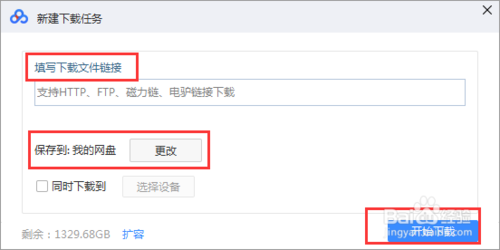 将你复制的链接粘贴到弹出来的对话框里就可以将文件下载到百度网盘里了。还可以同时下载到电脑上。