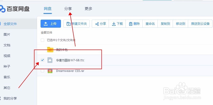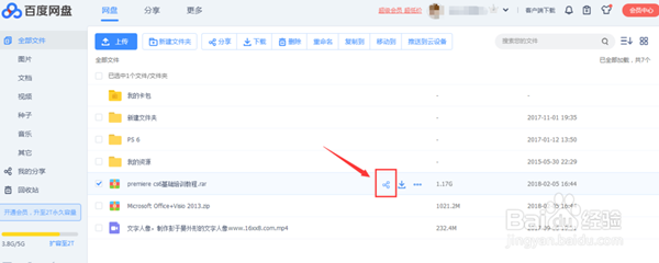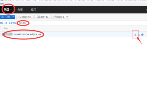 我们也可以将我们电脑里或者网盘里的文件分享给别人,先上传到网盘里,然后选中你要分享的文件,在上面找到分享的选项。