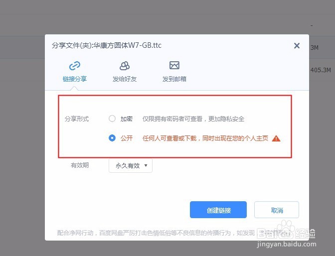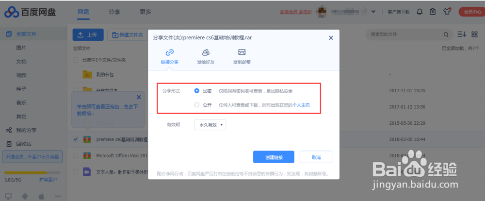 这时来到分享文件的页面,这里有3种分享形式:链接分享,发给好友,发到邮箱,这里我选择的是链接分享,分享形式有2种:加密和公开,这里我以选择加密为例。