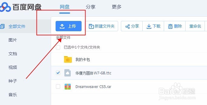 第二步:登陆百度网盘后出现下面界面,点击上传---上传文件,如果要上传文件夹,可选择上传文件夹。