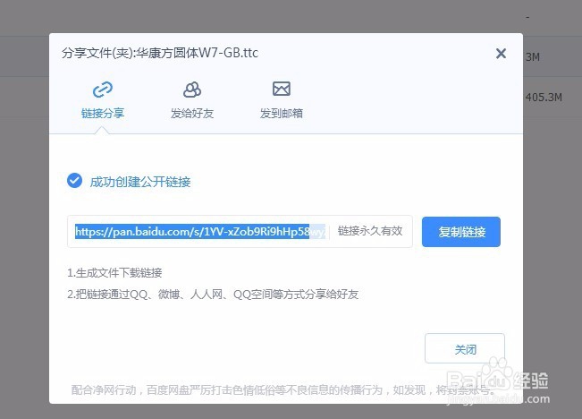 第六步:点击蓝色的按钮创建链接,百度网盘文件分享就成功了