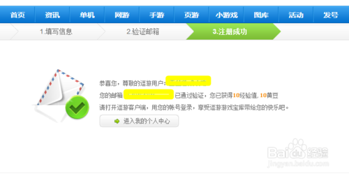 第三步,也是最后一步,完成注册。点击验证链接之后,系统会发来祝贺注册成功的信息,并获得10经验值和10个黄豆。逗游游戏宝库和网页都是同步的,在逗游游戏宝库里注册,就是在逗游官网上注册。
