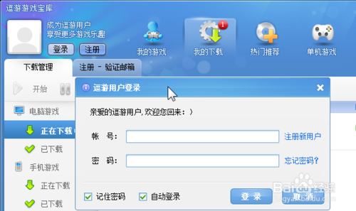 把我们刚刚完成的注册账号信息用一下吧!打开逗游游戏宝库,点击左上角的【登录】,成为逗游游戏宝库的正式用户。
