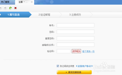 点击【注册】按钮,页面进行跳转,来到了注册账号的第一步:填写信息。我们需要填写的信息,主要有账号、密码、邮箱/QQ号、验证码,并且在“我已阅读且同意《逗游用户协议》”前打钩。