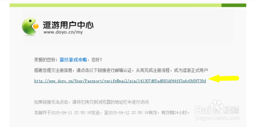 打开收件箱,第一封邮件,就是逗游用户中心发给我们的验证邮件,点击下图中的链接,完成注册。