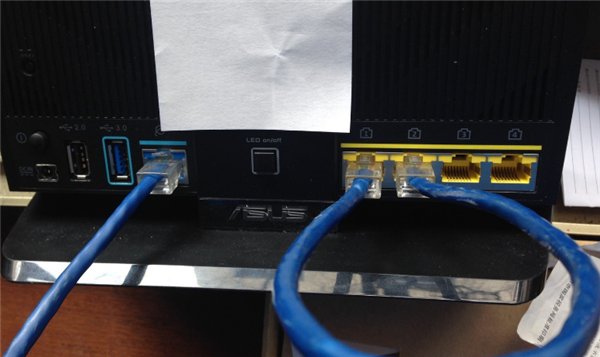 5.重启路由并将一条网线连接lan1与lan2 如下图(本图转载采用的是AC68U为例连接方法和网件是一样的)