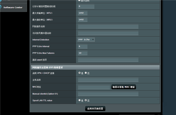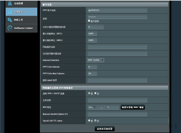 打开 外部网络-互联网设置-ethernet lan 填上宽带账号和密码 然后拉到最下面获取计算机的MAC 保存应用即可