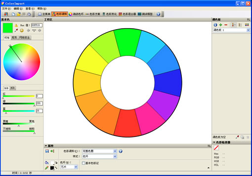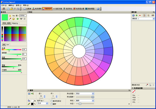 启动ColorImpact后,在软件窗口的左侧区域是用来选择颜色的,在默认状态下是以一个色环的方式来帮助我们选择颜色,同样也可以使用类似于Fireworks CS3的“混色器”面板方式和网络安全色方式来选择颜色,如图6.58所示。