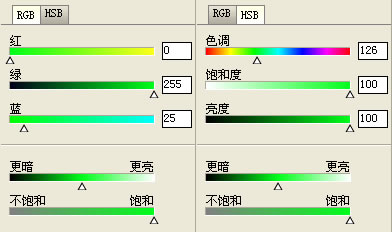 除此以外,在软件窗口的左下方,还可以按照RGB和HSB的颜色模式来选取颜色,并且控制颜色的明度和饱和度,如图6.59所示。