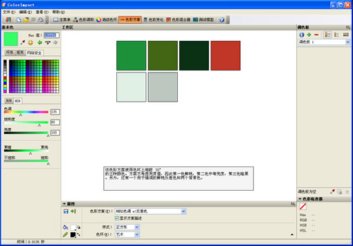 在ColorImpact软件主界面的上方,有一行快速选择按钮,通过选择这些不同的按钮,我们可以以不同的方式来浏览色彩。当我们在软件窗口左侧的区域选择了颜色以后,软件会自动给出所选择的颜色的搭配方案,并且在软件窗口的中间部分显示出来。