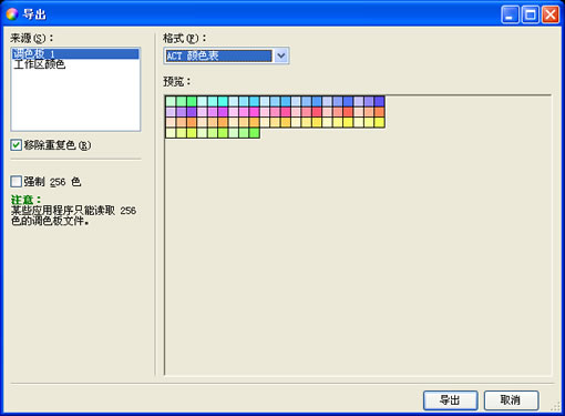 接下来可以选择“文件”→“导出”命令,打开ColorImpact软件的“导出”对话框,在这个对话框中可以选择导出的颜色格式,如果我们希望导出的颜色能够在Fireworks CS3中调用的话,可以选择导出为ACT的颜色表,如3-67所示。