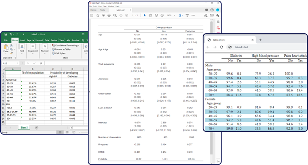 用户一直希望我们提供更完美的表格,现在您可以很容易地创建比较回归结果或汇总统计数据的表格,您可以创建样式并将其应用于您构建的任何表,还可以将表导出到MS Word?, PDF, HTML, LaTeX, MS Excel?, 并将它们插入到报告中。新版本修改了table命令,新的 collective 前缀可以从任意多个命令收集任意多的结果,生成表格,并将其导出为多种格式等。您还可以使用新的Tables Builder来单击并创建表格。