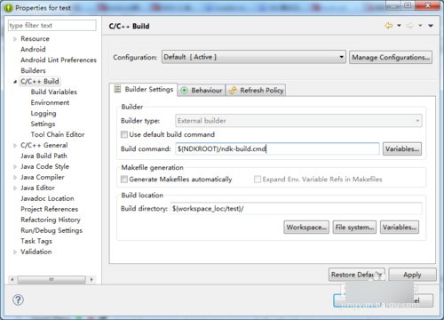 工程右键,点Properties->C/C++ Build的Building Settings中去掉Use default build command,然后输入${NDKROOT}/ndk-build.cmd