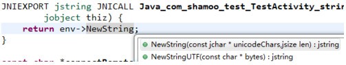 接下来仿着NDK的demo,Hello-JNI工程写一下。使用Alt + '/'可以代码提示!很爽!有木有?之前用CDT时候死活都按不出代码提示,郁闷...