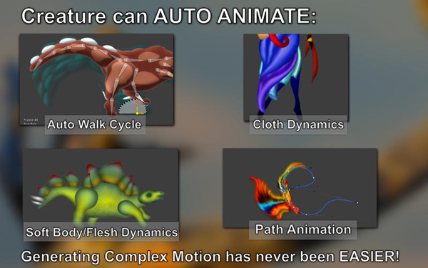 Creature会让你重新思考2D动画是如何完成的。Creature的核心是可直接使用的自动动画引擎,这是一项令人难以置信的强大技术,可让您制作出传统骨骼动画软件可能无法想象的动作。Creature为动画提供传统工具,如FK和IK链,然后进一步扩展,为您提供一些非常先进的工具:物理弯曲电机,自动步行循环生成,可直接操作的肉体/肌肉/柔体动力学,高级智能骨骼加权,2D运动捕捉以及更多。