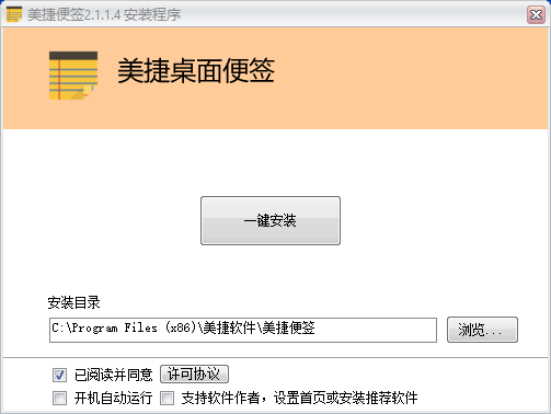 1、从本页面下载好美捷桌面便签软件包,解压后双击打开exe,进入安装向导,单击【浏览】选择软件安装位置,确定后单击【一键安装】