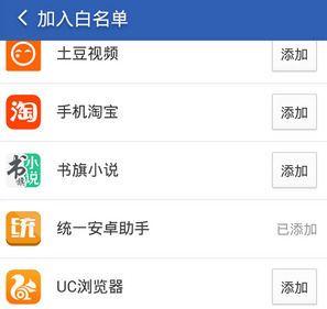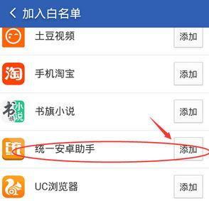 6、找到要加入白名单的应用,小编此处以【统一助手】为例,点击统一助手右侧的【添加】,就可以把它添加到进程白名单了