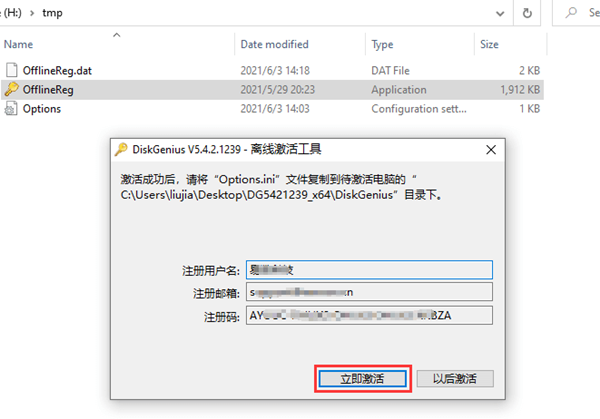 6. 在可以上网的电脑上,双击"OfflineReg.exe" 文件,然后点击"立即激活"按钮。如下图所示: