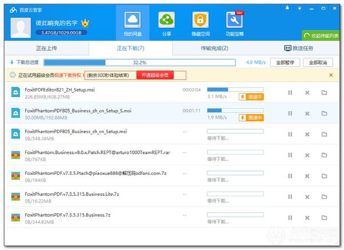 百度网盘为您提供文件的网络备份、同步和分享服务。空间大、速度快、安全稳固,支持教育网加速,支持手机端。百度云管家,是专门为百度网盘设计的,支持便捷地查看、上传、下载云端各类数据。通过存文件,不占本地空间。上传、下载文件过程更稳定,不会因浏览器、网络等突发问题中途中断,大文件传输更稳定。 经常使用百度网盘客户端的人应该都知道,随着百度云用户越来越多,为了推广VIP会员盈利,开始在客户端程序里加入了限速策略,而现在有了诸多大牛特别下载速度限制补丁,可以特别下载速度限制,让普通用户登陆即为SVIP超级会员,下载文件自动提速,突破试用提速特权,让下载提速时间无限!爽爆了!此次提升了文件列表加载速度,操作明显流畅;新版数据线功能,电脑手机现在可以连接互传文件,支持在线打开CAD文档、在线播放asf格式文件。